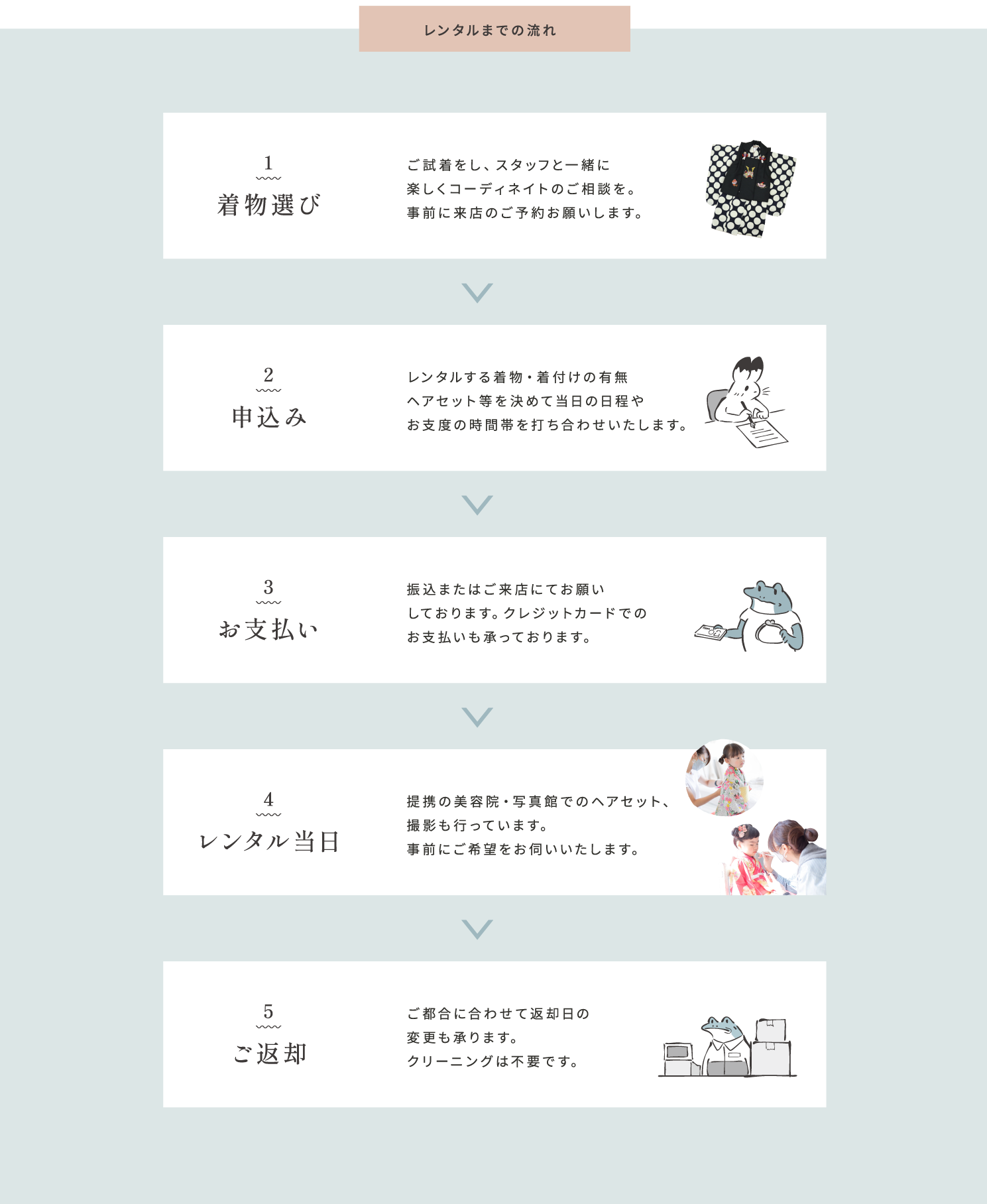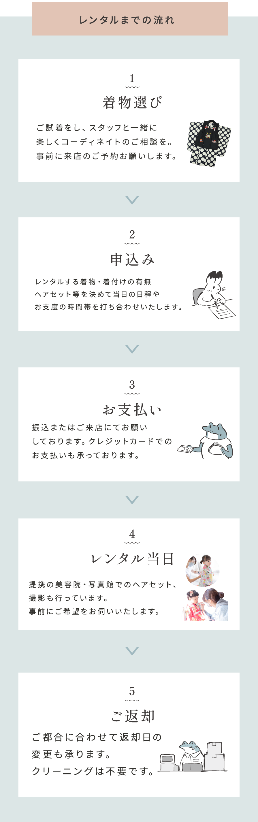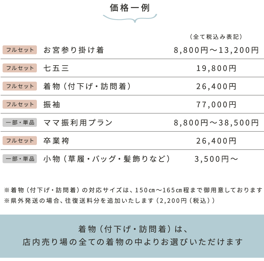 レンタル期間は、原則3泊4日となっております。 レンタル品は、肌着・足袋・草履・バック・髪飾り等も全て含まれております。 振袖レンタルでは、上記に加え補正タオル5枚つきです。 県外発送分の返却は、返送用伝票を入れておりますので、お近くのコンビニよりご返送下さい。 ご予約の上、お越しくださいませ